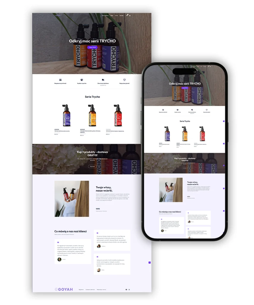 Dla marki GOYAH przygotowaliśmy kompleksową realizację strony internetowej, której celem było stworzenie nowoczesnej, czytelnej i intuicyjnej platformy sprzedażowej. Sklep goyah.pl to miejsce, w którym użytkownicy mogą poznać i zakupić specjalistyczne kosmetyki trychologiczne, stworzone we współpracy z ekspertami z branży.